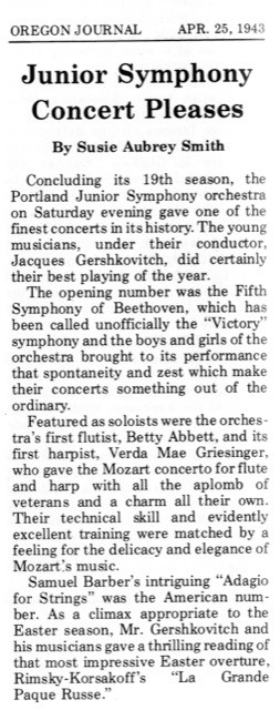 Check out a 1943 review from the Oregon Journal of a PJS concert. It mentions the premiere performance of Samuel Barber’s Adagio for Strings.